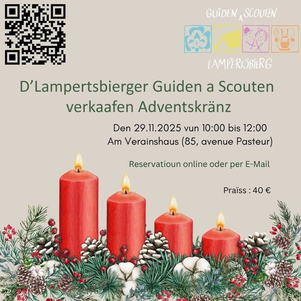 Dir kënnt ären Kranz den 29. November tëschent 10:00 an 12:00 bei ons an d’Veräinshaus op de Lampertsbierg sichen kommen (85, avenue Pasteur L-2311 Luxembourg).